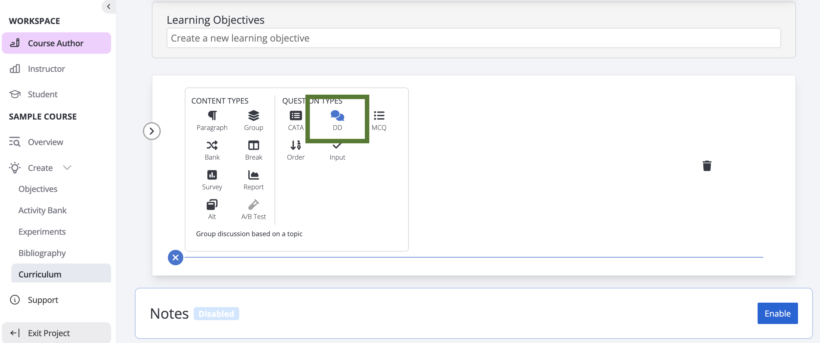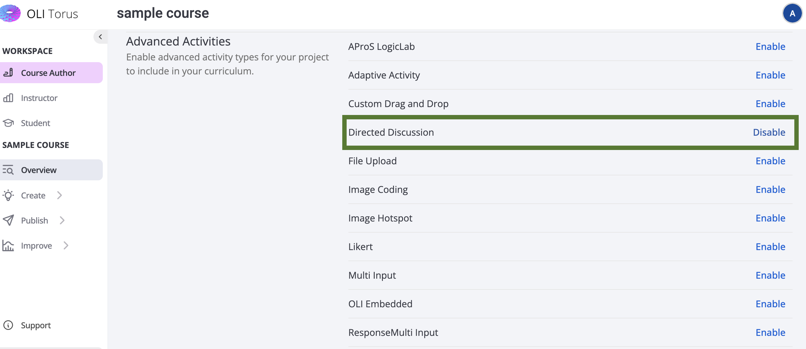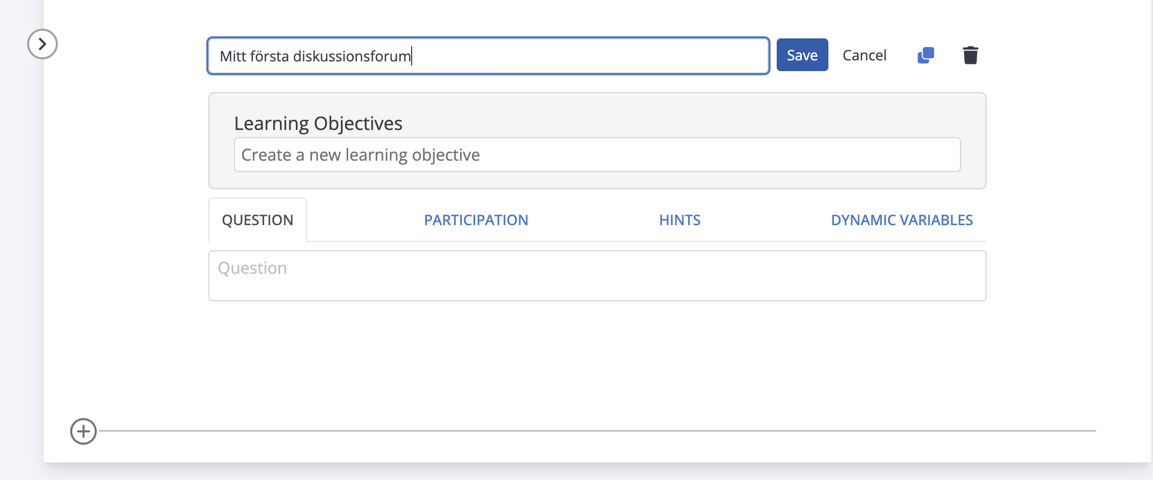Den första varianten är en Innehållstyp som heter Directed Discussion, denna måste aktiveras på följande sätt, detta är det forum som rekommenderas för lärarledda forum.