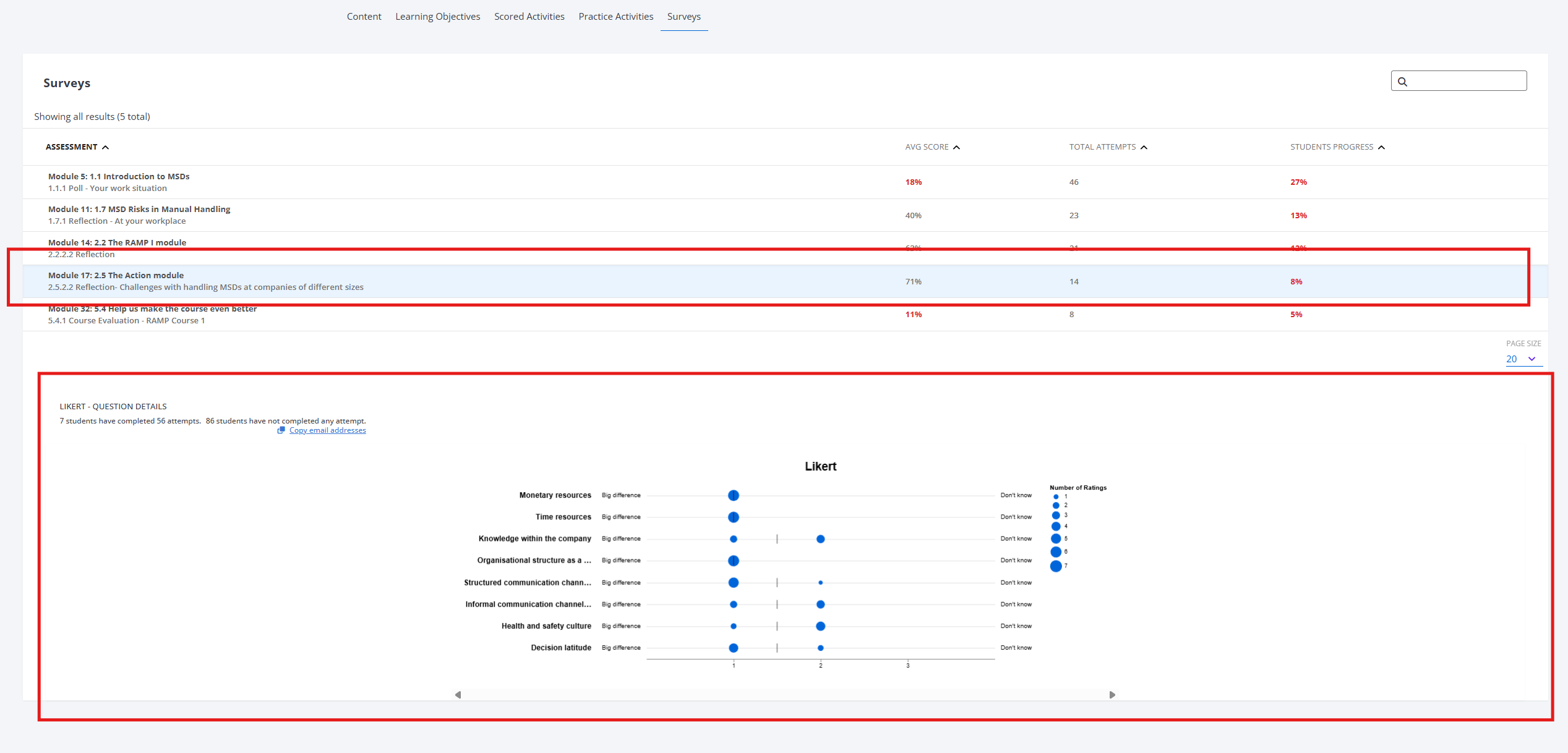 2. För mer detaljerad statistik, se exempel nedan på en Survey med frågetypen Likert: